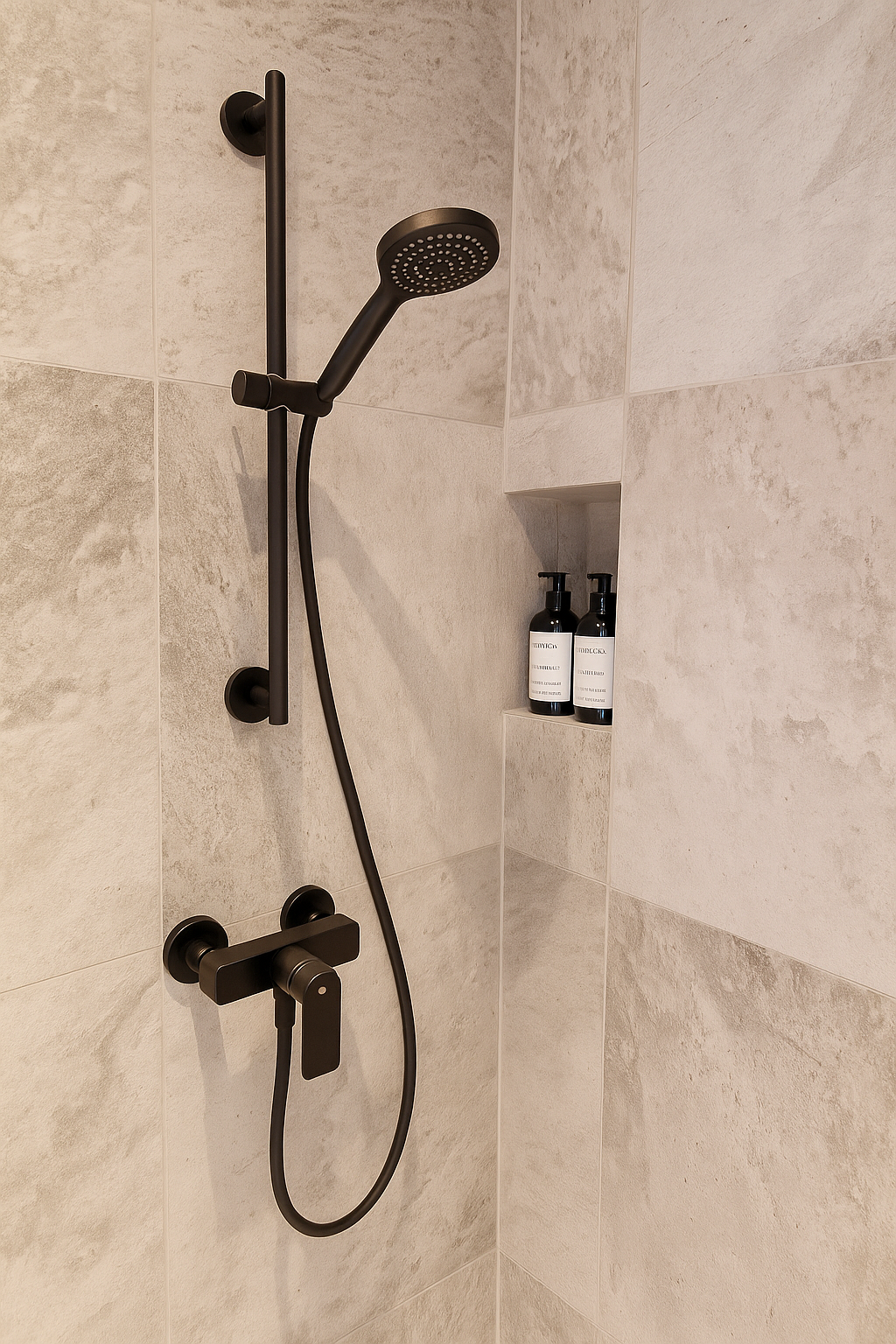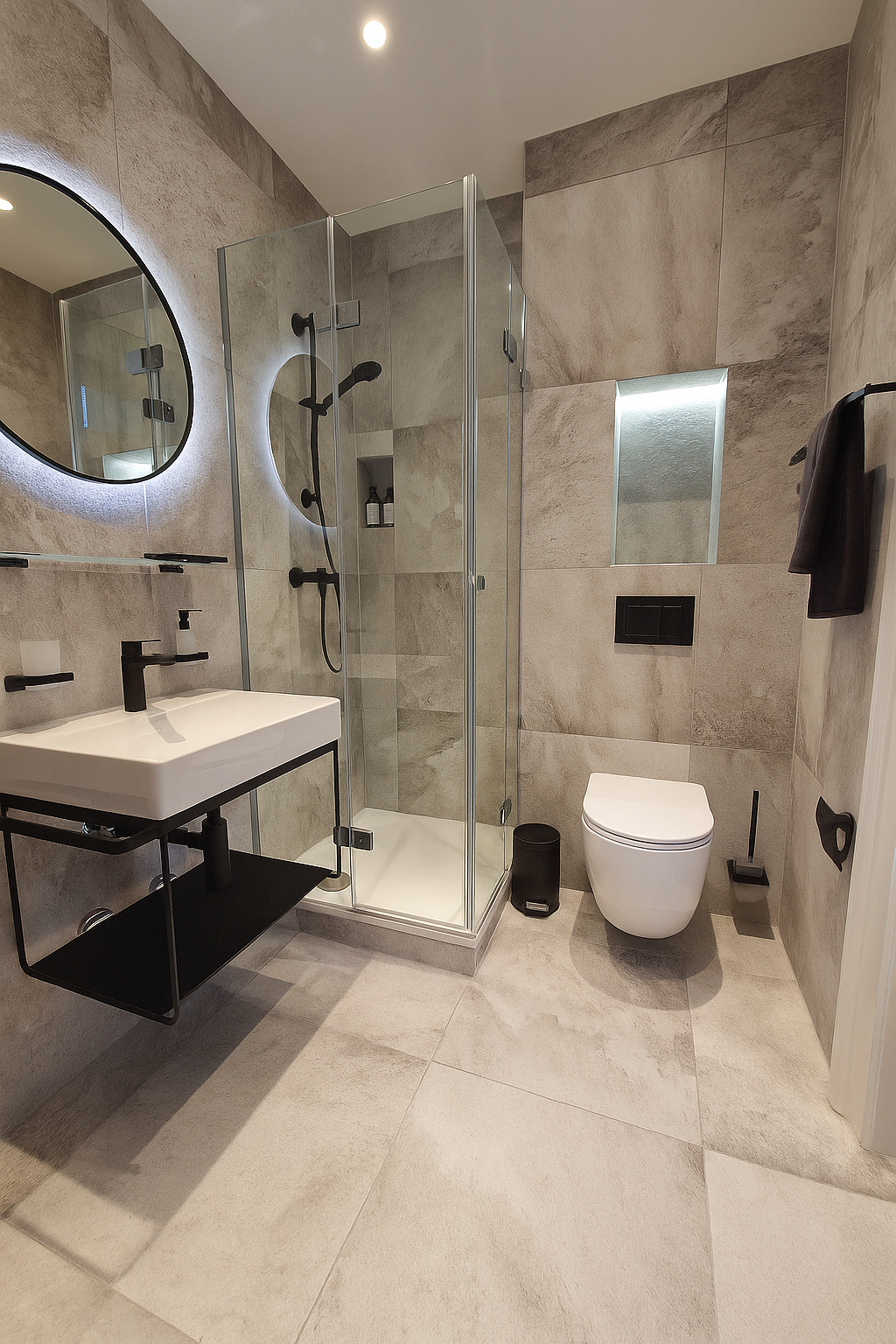 The bathroom is designed with elegant grey-white marble tiles that create a refined, spa-like atmosphere. A shower with sleek black fixtures adds a modern touch, while built-in illuminated niches offer both practicality and style for your toiletries.