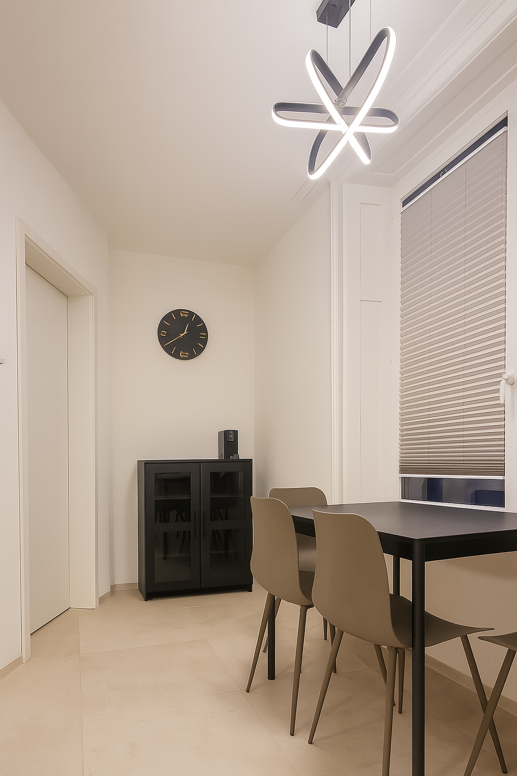 This stylish space features two sleek sofas – a two-seater and a single – both easily convertible into comfortable beds. The cosy yet refined atmosphere is perfect for relaxing, reading, or simply unwinding after a day in the city.